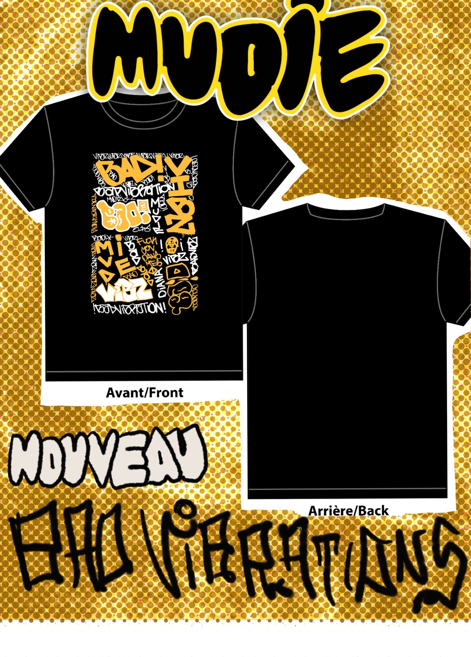 Les shirts sont noirs et le print est jaune et blanc.