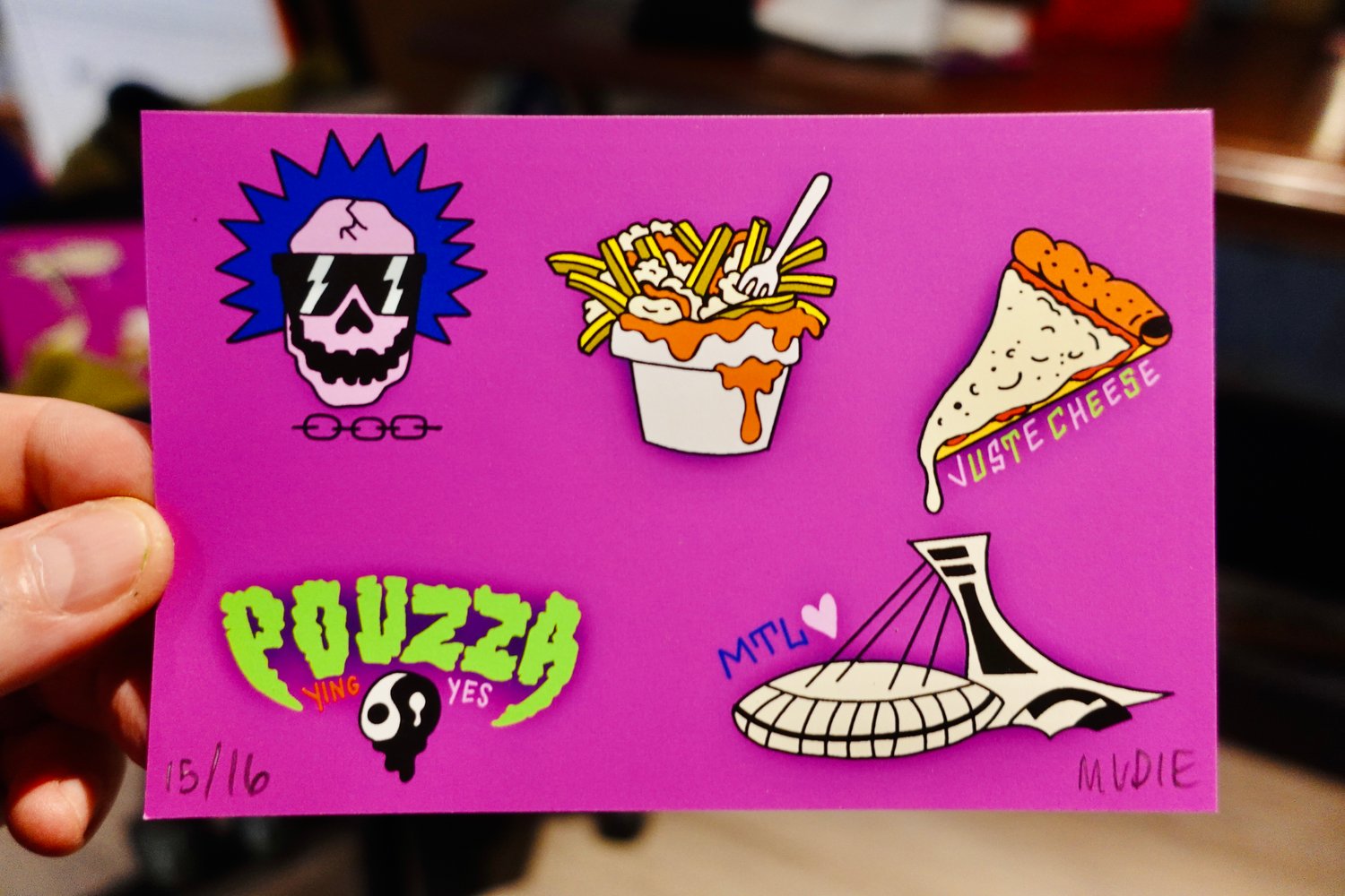 Y'a le bonhomme Pouzza, un genre de squelette crust mais un peu 80s. Y'écoute son Cinderella. Une poutine, une pizza juste fromage, un ying yang qui dit " ying yes " et le stade olympique parce que c'est le plus beau symbole de Montréal.